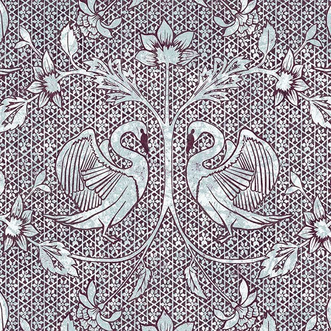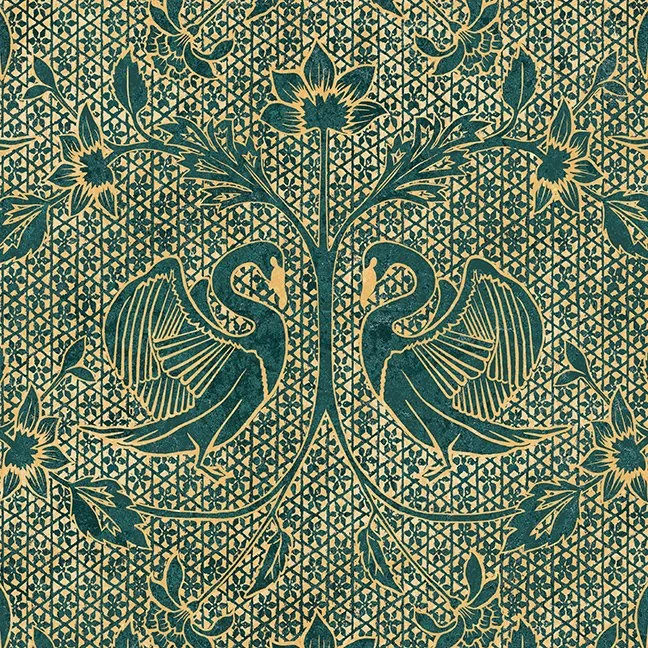 While researching Hearst Castle, I saw images of Swan sculptures by its pool. This pattern is an homage to those swans and to Fortuny fabrics which decorated the castle.